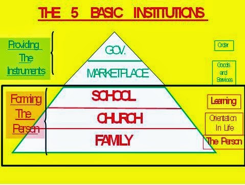 All of these fundamental tasks of society are not only important—they are irreplaceable. And at the foundation of them all is the first, the family. Thence comes the next generation and every actor in every institution. There also are all these basic tasks executed… family, religion, education, marketplace and government. Thus it is there that the education of the future citizen in all five tasks begins and is most shaped.